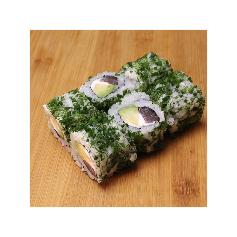 Maki inversé avec de la ciboulette, aneth et coriandre hachées.